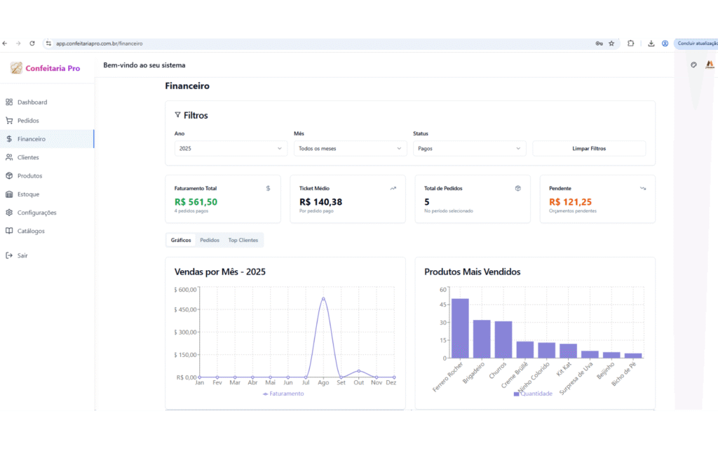 Visualize seus pedidos em tempo real com gráficos e indicadores que mostram exatamente o andamento da sua confeitaria